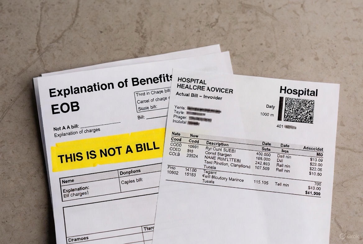 · Explanation of Benefits (EOB): This is NOT a bill. It’s a statement from your insurer showing what was billed, what they allowed, what they paid, and what you owe. Always match it to your actual medical bill.