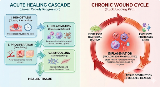 Answer: Think of inflammation as the body’s cleanup and alarm phase. In chronic wounds, the initial cause of damage (like pressure or poor blood flow) often persists, constantly re-injuring the tissue. This creates a cycle where the body keeps sounding the alarm (inflammation) but can’t move on to the repair and rebuild phases. High levels of destructive enzymes and bacteria in the wound can also perpetuate this stalled state.