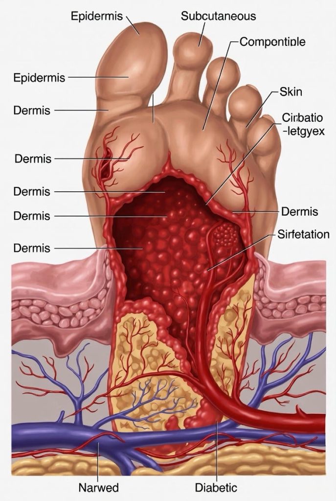 Answer: A diabetic foot ulcer (DFU) is an open sore or wound that typically occurs on the bottom of the foot in people with diabetes. It’s more than a simple cut—it’s a complex wound that develops due to a combination of nerve damage (neuropathy), poor circulation, and high blood sugar, which together prevent normal healing and increase infection risk.