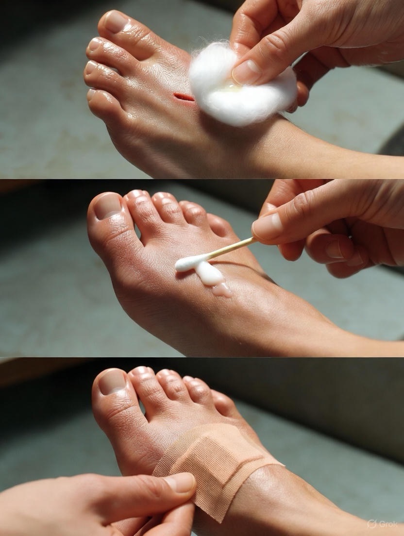 · Apply a thin layer of moisturizer (like urea-based cream) on dry areas, but not between toes, as excess moisture there can lead to fungal infection.