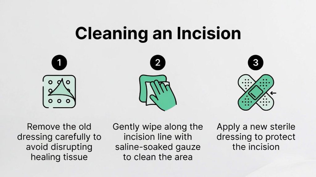 · If instructed to use saline or water: Gently pour or use gauze to apply the solution. Wipe once from top to bottom along the incision line. Use a new gauze pad for the next wipe. Never scrub or go back-and-forth.