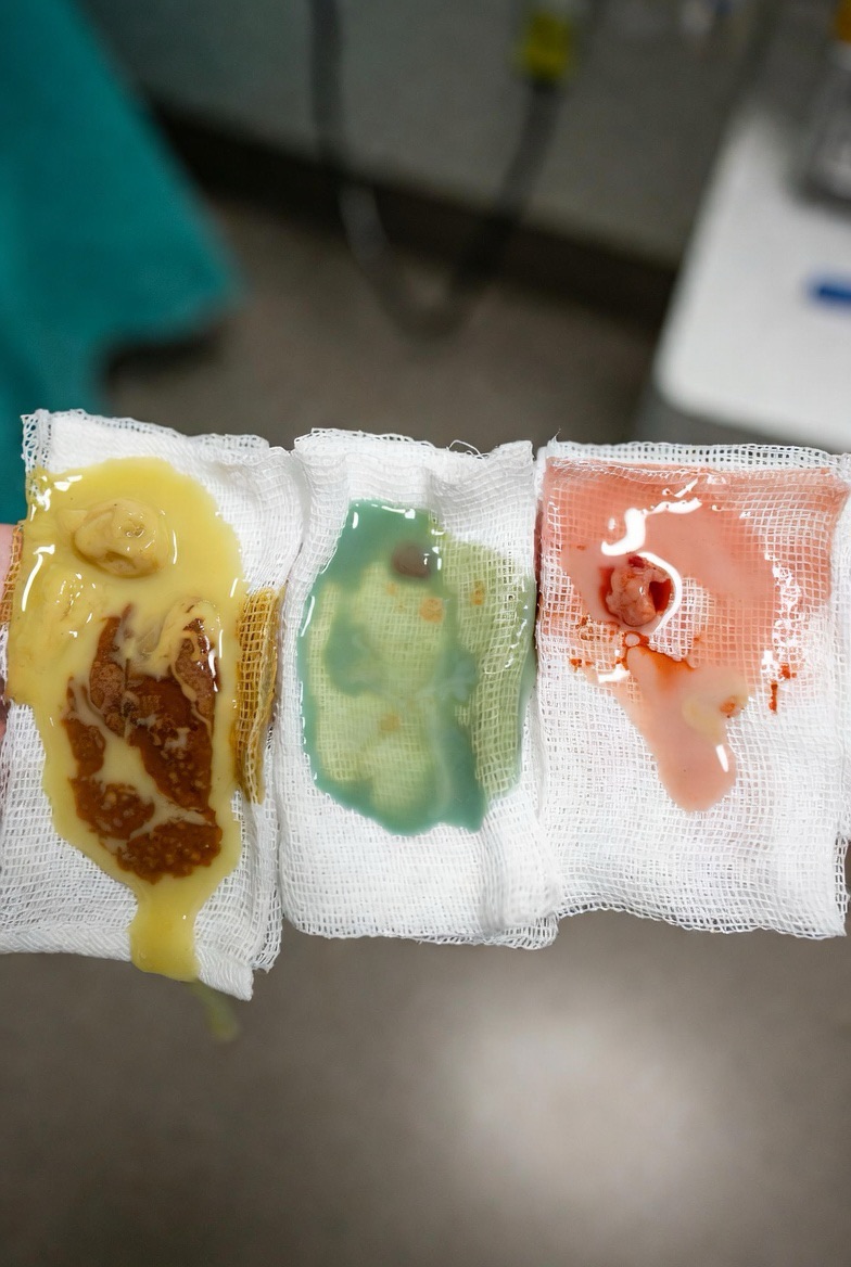 · Infected: Pus—thick, opaque, yellow, green, gray, or brown discharge. May be foul-smelling. Increased drainage after initial healing has begun is also suspicious.