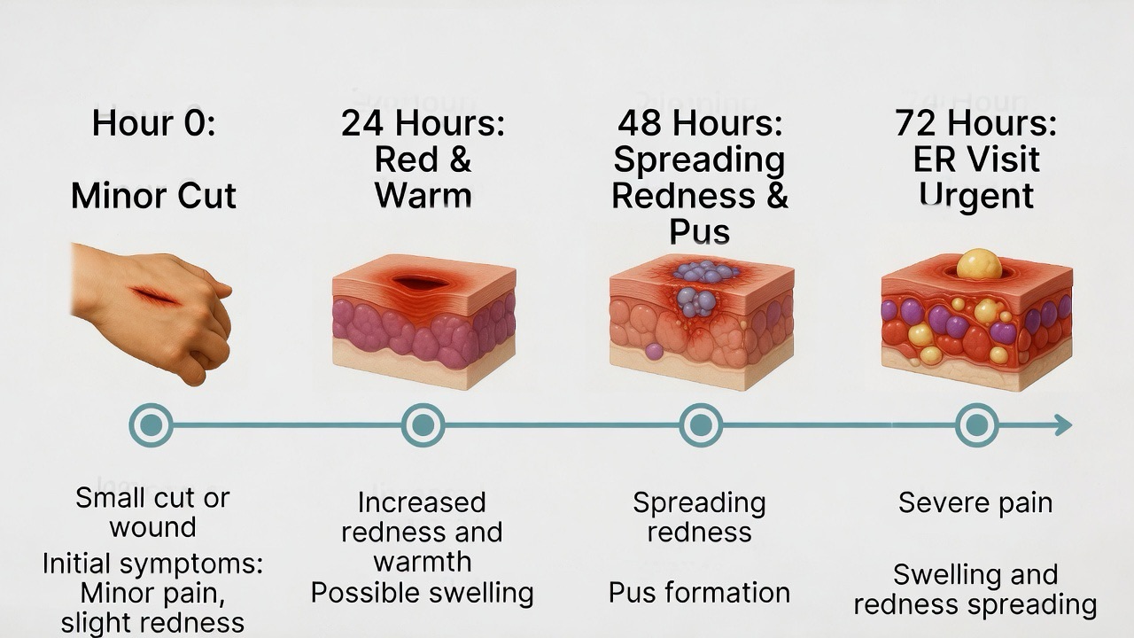A: Alarmingly fast. A minor infection can progress to cellulitis (deep tissue infection) within 24-48 hours. Life-threatening sepsis or necrotizing fasciitis (“flesh-eating bacteria”) can develop in a matter of days or even hours if untreated. This is why daily monitoring and prompt action on early signs are crucial.